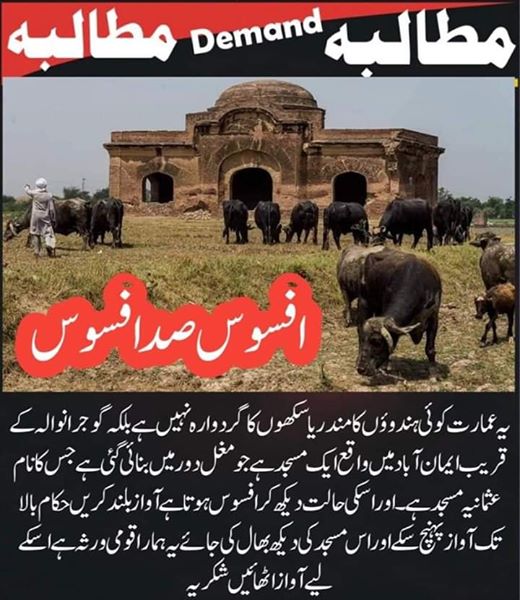 سوشل میڈیا پر ایک پوسٹ نظر سے گذری جو گوجرانوالہ کے قریب ایمان آباد میںواقع ایک مسجد کی ہے،جو مغل دور میں بنائی گئی ہے،جس کا نام عثمانیہ مسجد ہے،حقیقت میں اگر ایسا ہی ہےجو تصویر میں دکھایا گیا ہے تو ہم مسلمانو ں کے لئے بہت ہی افسوس کا مقام ہے۔اسی طرح کی اور کئی ایسی مسجدوں کی ویرانیاں اور پھر ان کی بربادیاں کسی باشعور اور زندہ ضمیر مسلمان اور کسی صاحب نظر انسان سے مخفی نہیں ۔ آہ افسوس صد افسوس! کہ ہم مسلمان اپنے بڑوں ، بزرگوں کے آثار و نشان اور ان کے تعلیمی اور تعمیری کارناموں کا جو کہ مدارس و مساجد کی شکلوں میں ہے تحفظ نہ کرسکے نہ ہی ان مساجد کی اراضی کو ہم بچاسکے ۔ذلت ہی ذلت ہے ،شرمساری ہی شرمساری ہے ، رسوائی ہی رسوائی ،بدنامی ہی بدنامی ہے ،ان مسلم لیڈروں اور نمائندوں کے نام جو مذہب کے نام پر اقتدار پر ہیں ۔ اقتدار کے لالچی ہیں کرسیوں کے حریض ہیں ۔ صرف ان کا مقصد حکومتوں کی گدی نشینی کے سوا اور کچھ بھی نہیں ۔ نہ انہیں اللہ سے محبت نہ رسول اللہ سے واسطہ ۔